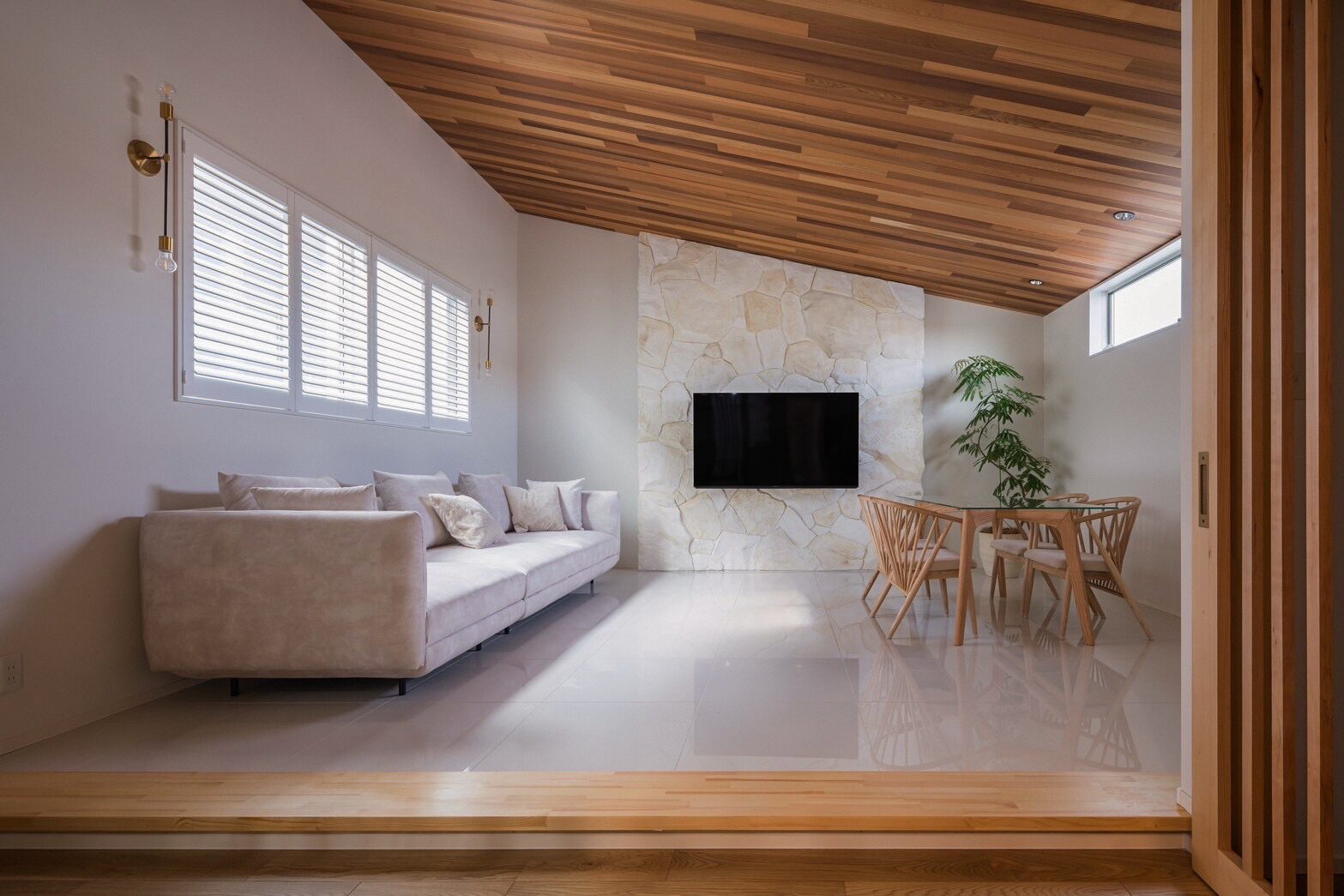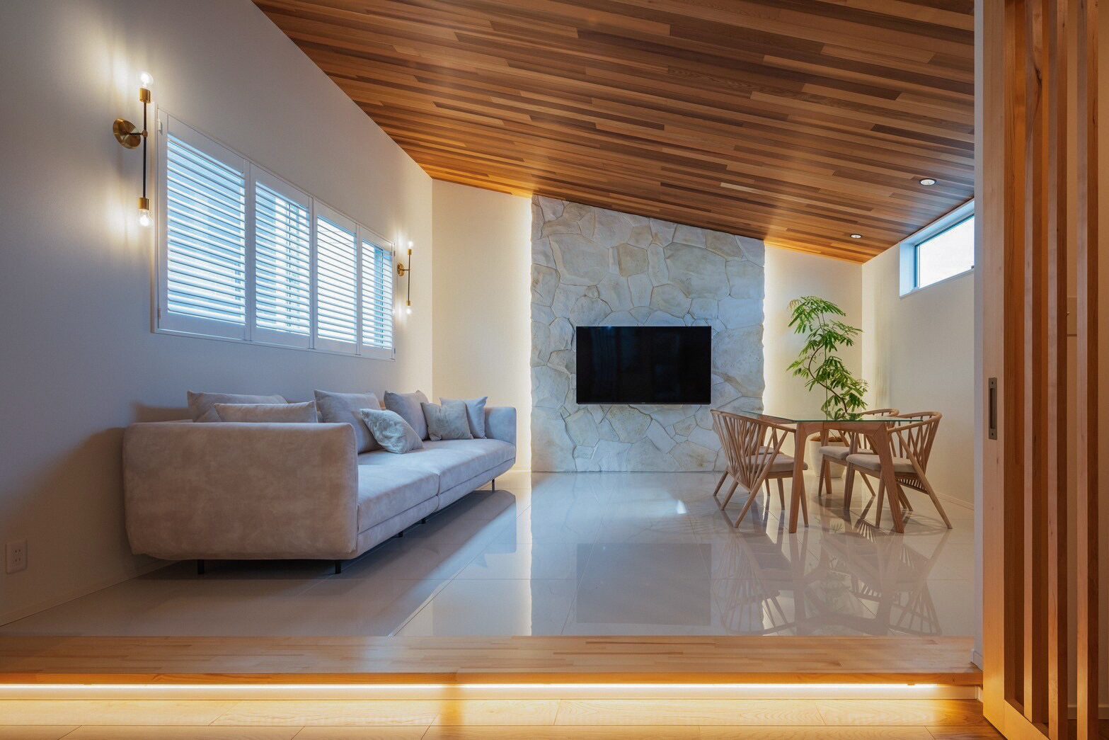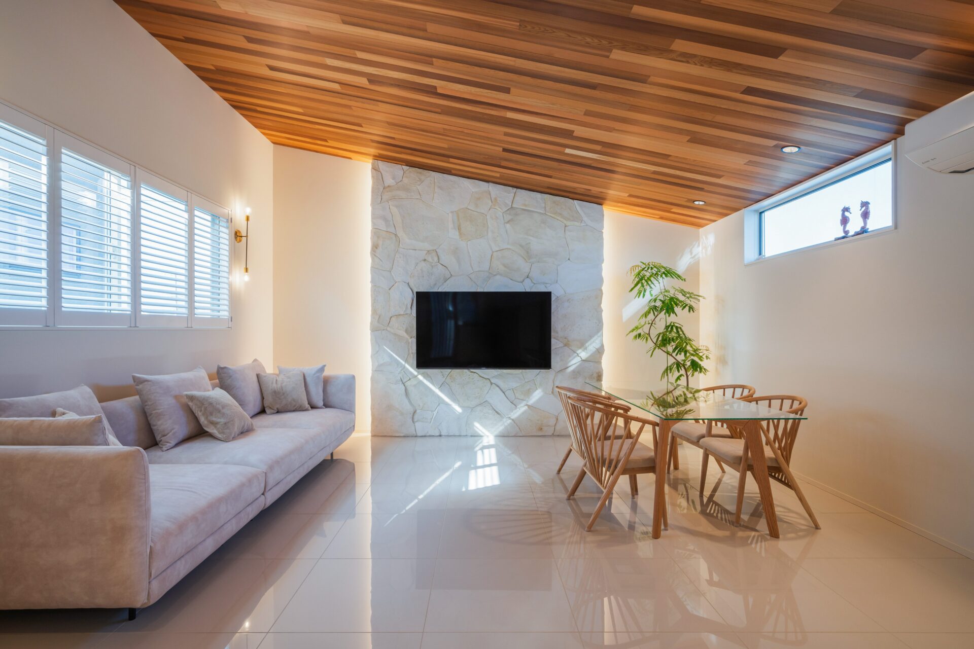 こちらのお家では、リビングの主役となるテレビ背面に、大胆な石壁を施工しました。