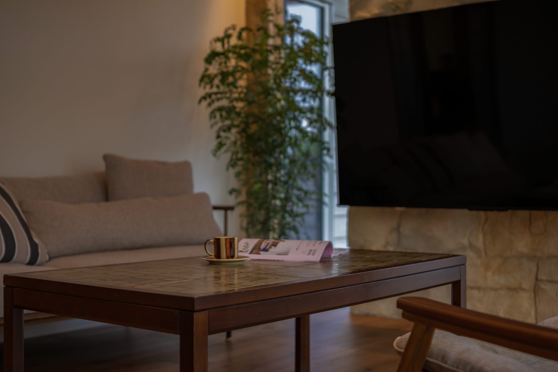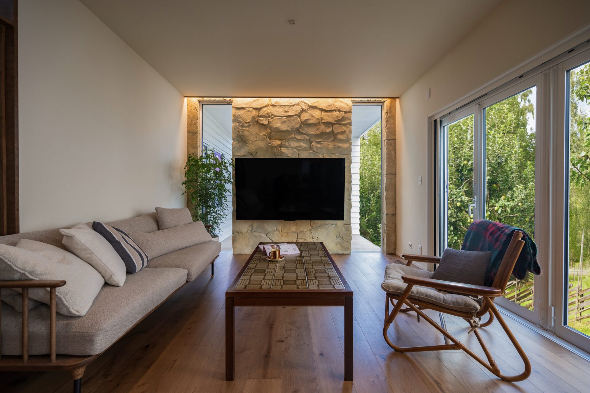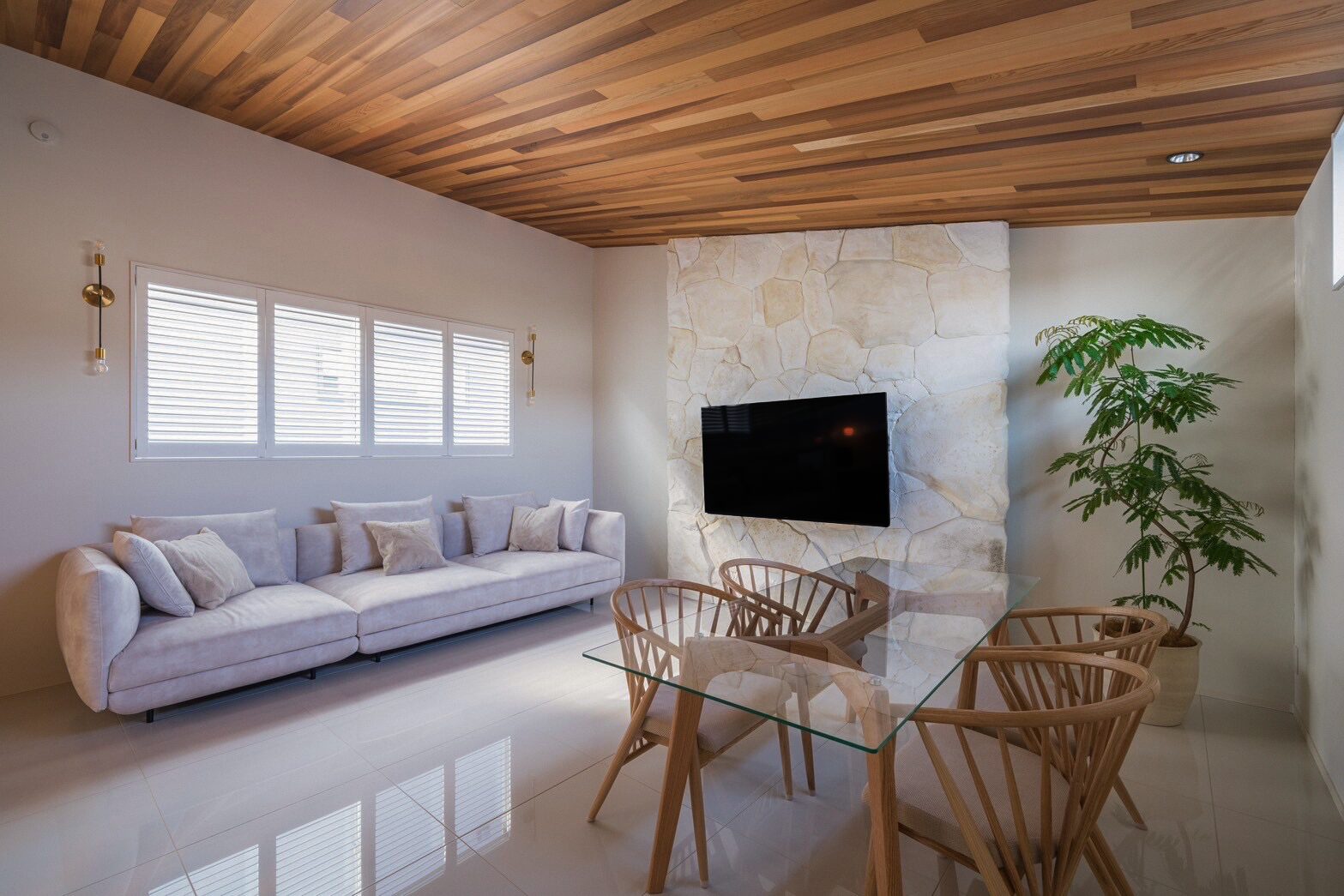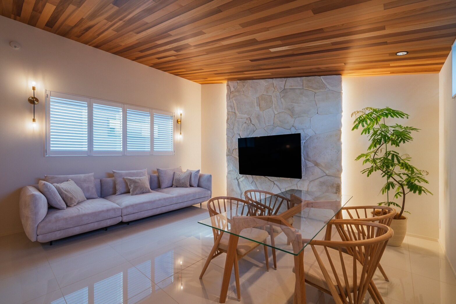 【03:北欧スタイル:リビングを彩るリゾートライクな石壁】