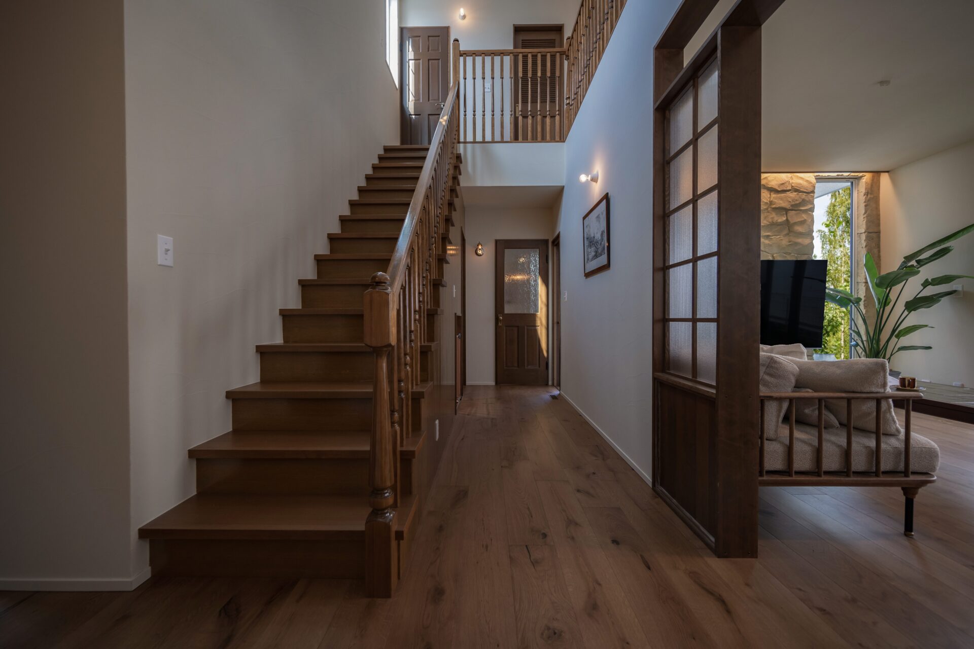 その先にはご夫婦それぞれの書斎があり、まさに「趣味を楽しむ大人の隠れ家」へと続くプロムナードのような空間になりました。