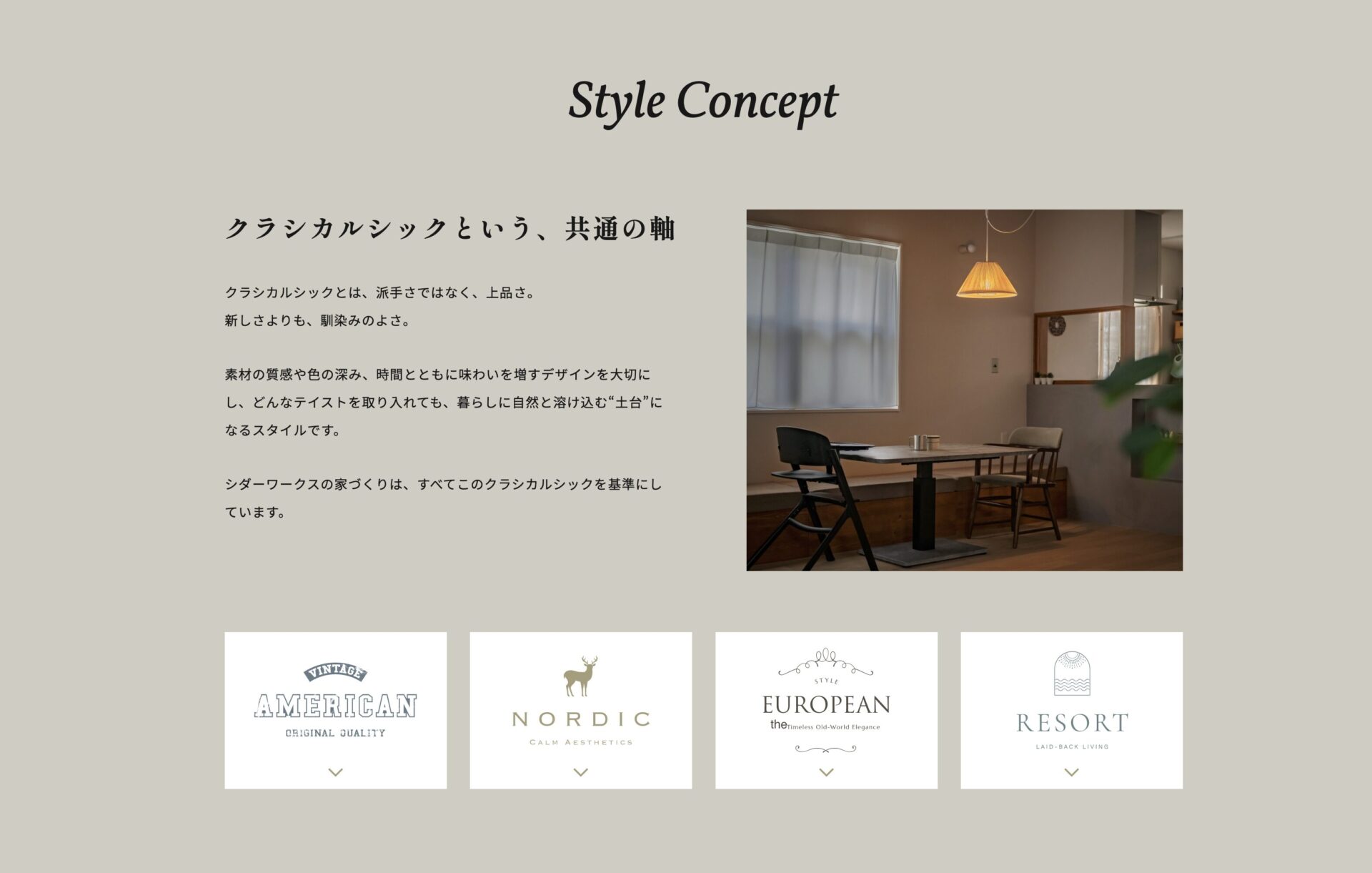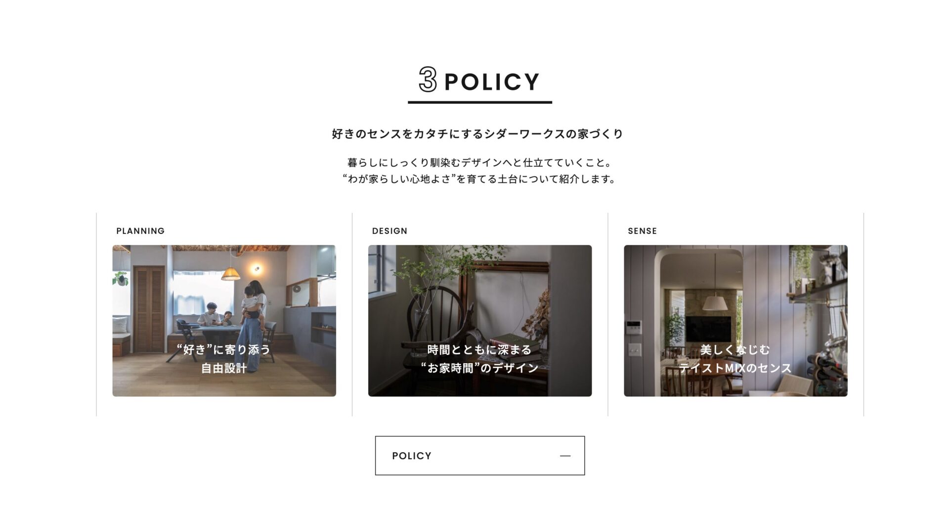 ▲続いて下に行くとシダーワークスこだわりのデザインスタイルがわかりやすくまとまっています。