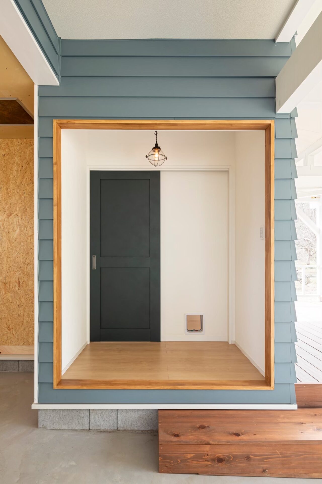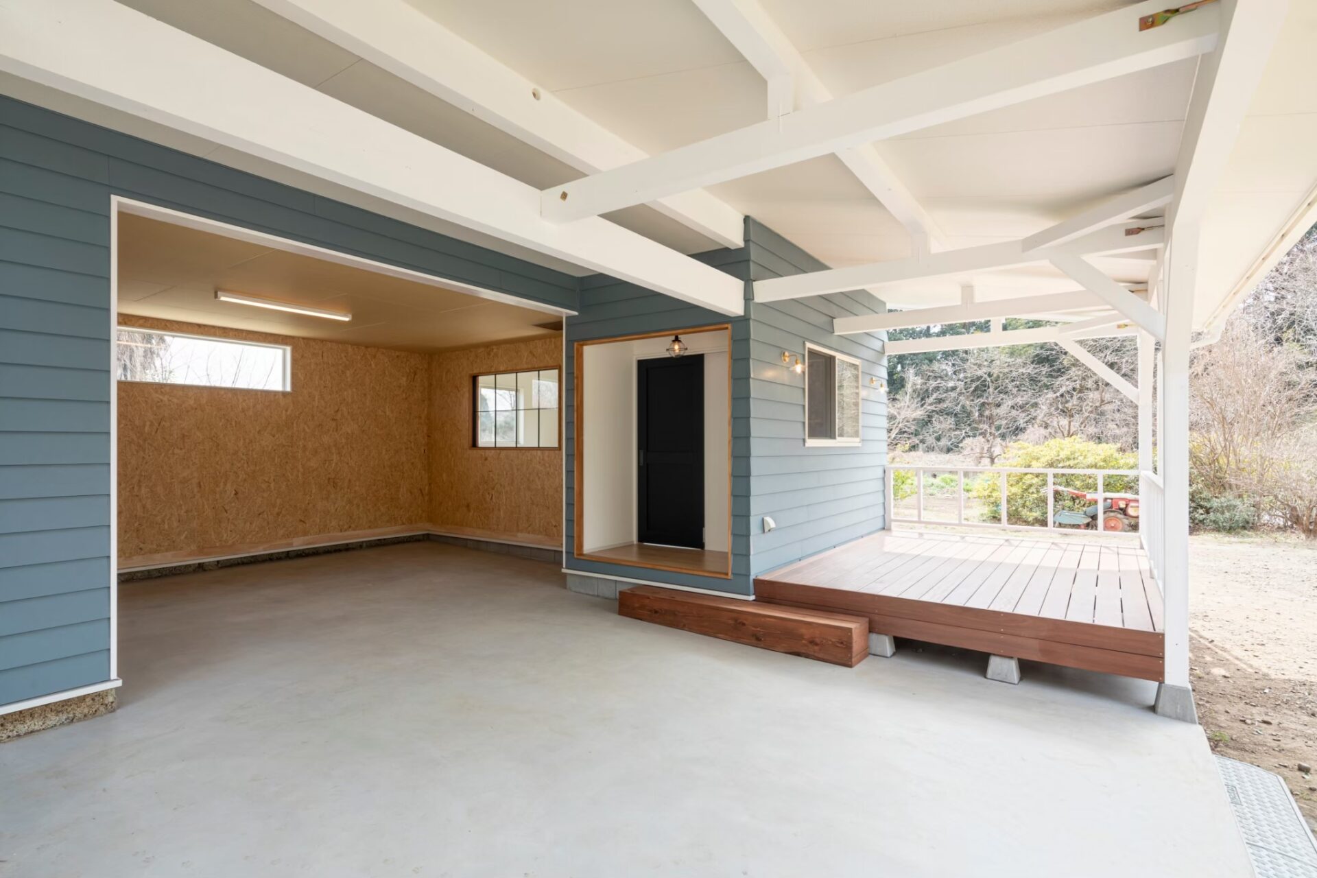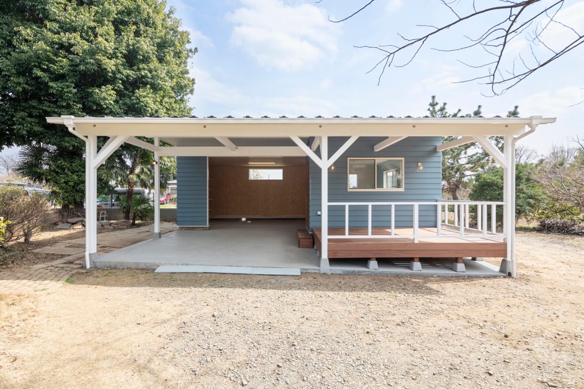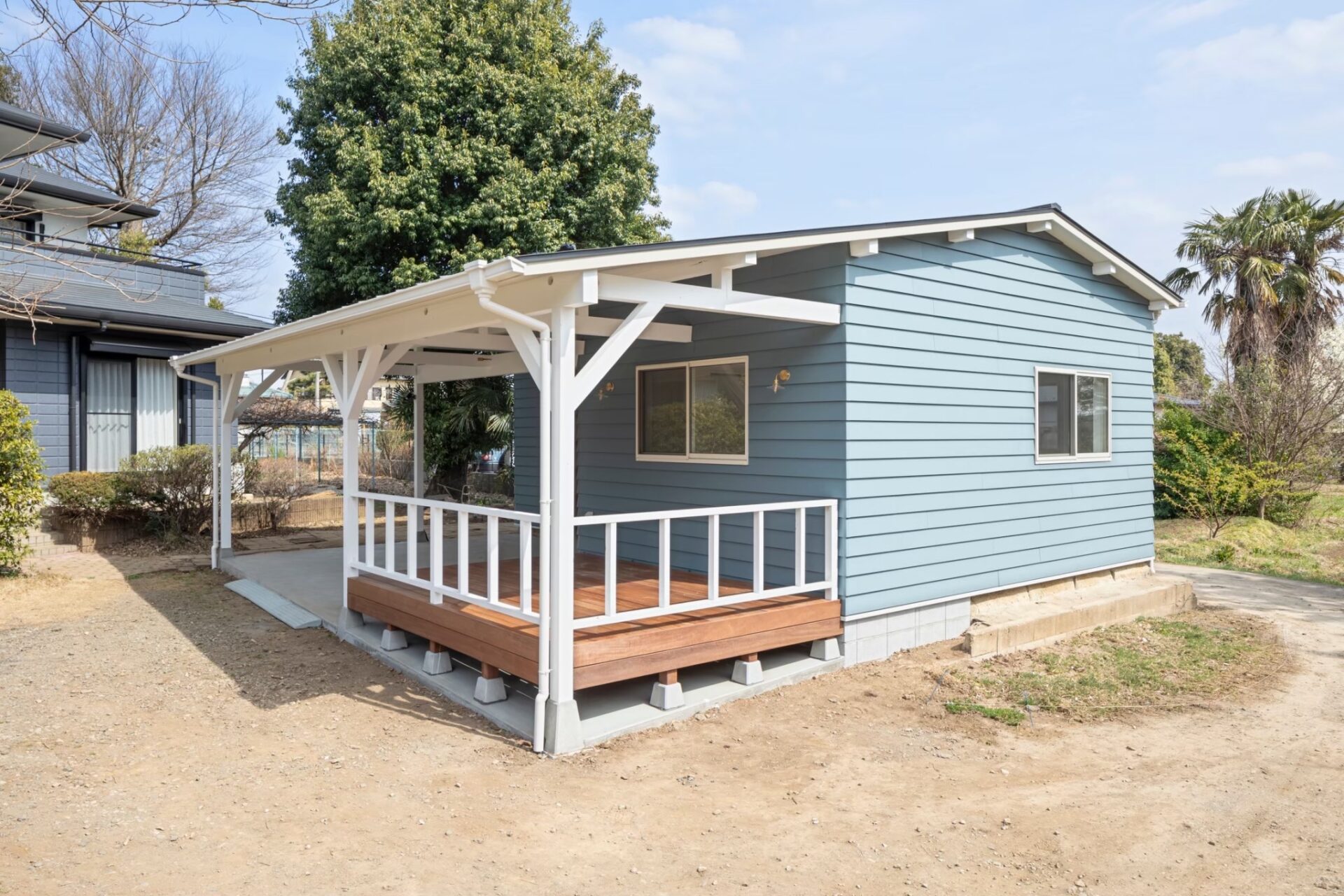 ブルーのラップサイディングやウッドデッキなど、