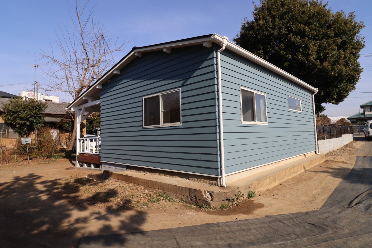 ブルーのラップサイディングが映える外観