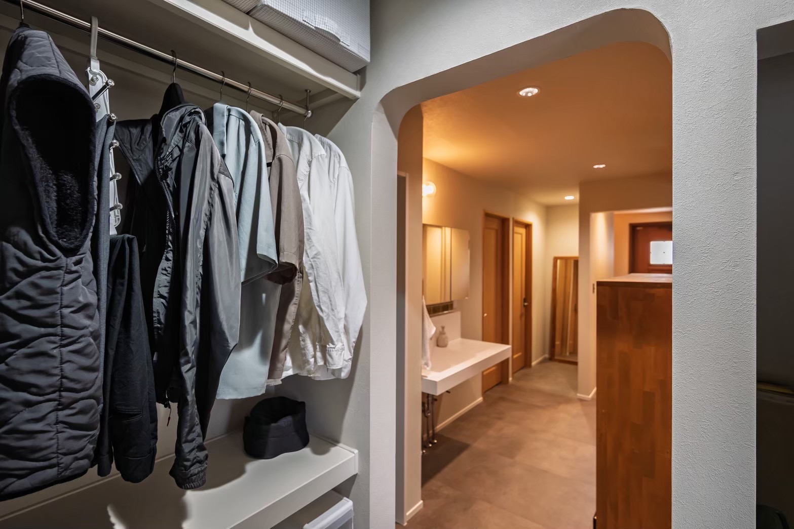アーチ開口でつながるウォークインクローゼット