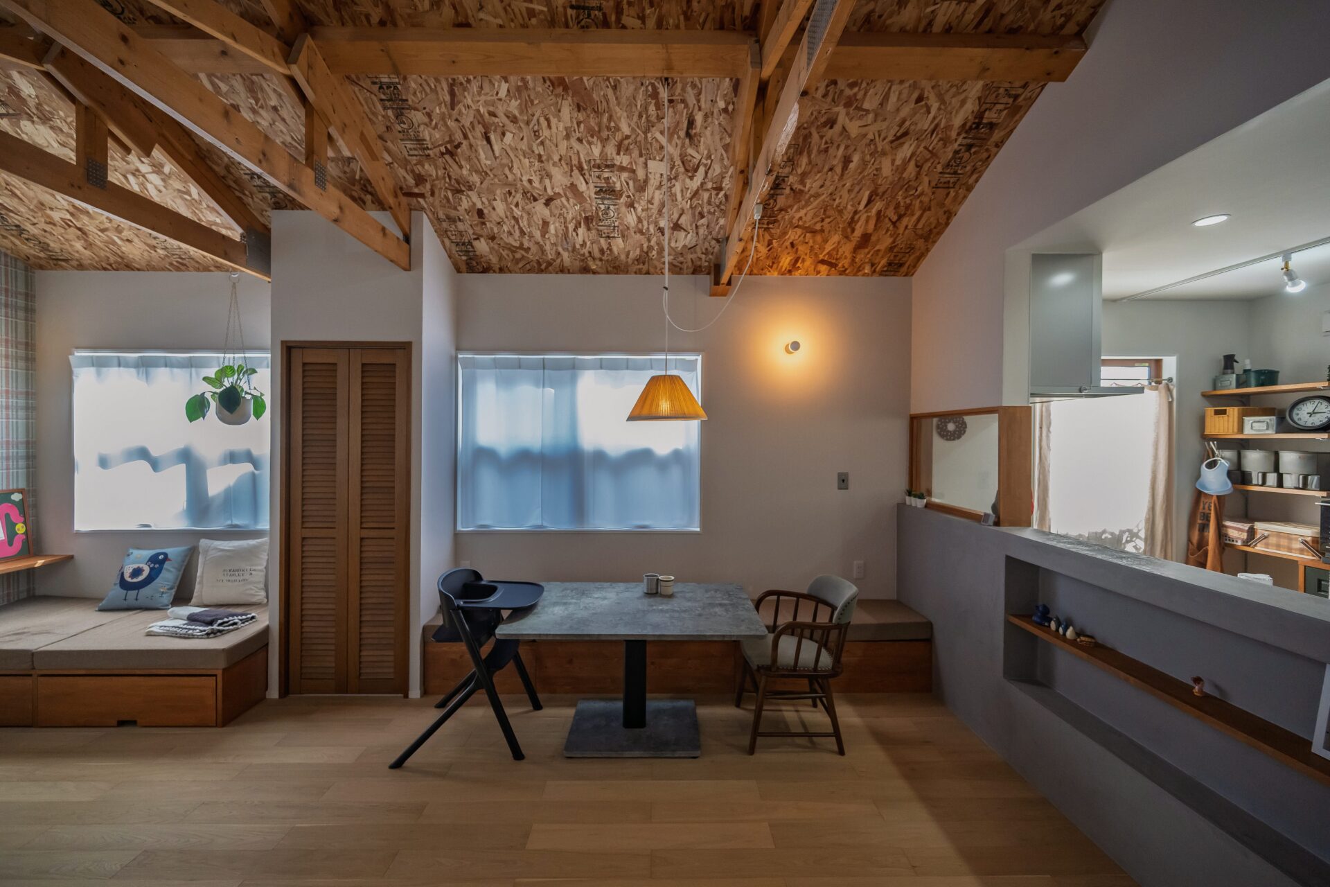 造作ベンチでくつろげるダイニングスペース